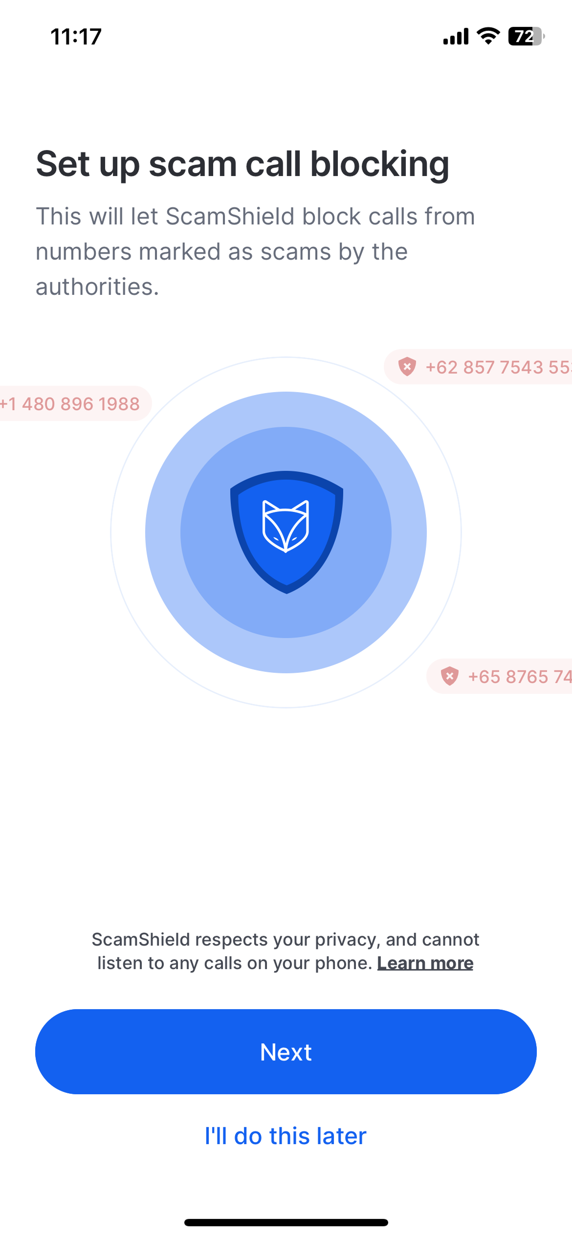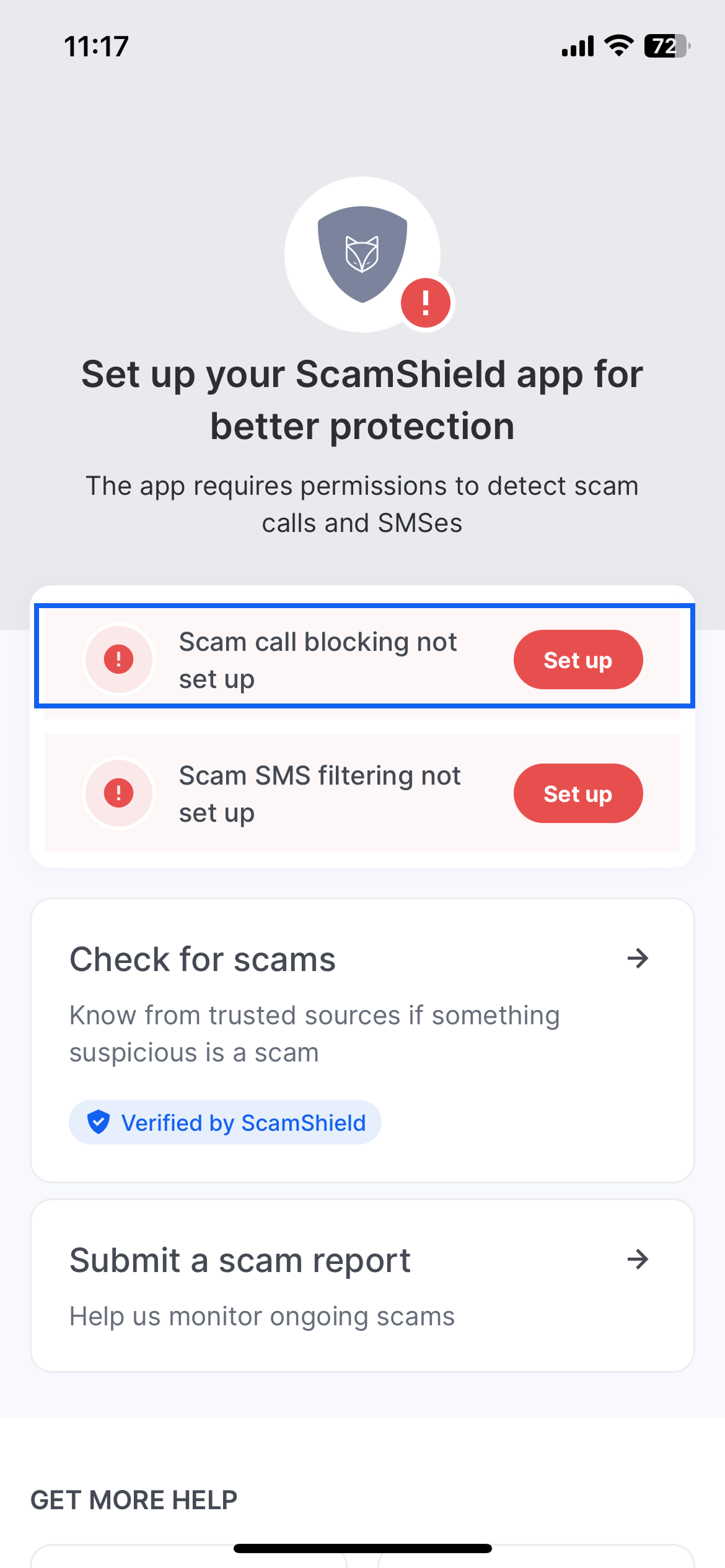 Step 1: Launch ScamShield. Click on "Set up" next to 'Scam call blocking not set up'.