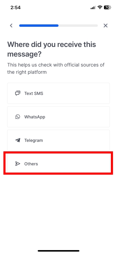 Step 1: Launch ScamShield App > Click on 'Check for Scams' > 'A message you received' > Select 'Others' when asked to choose where you got this message.